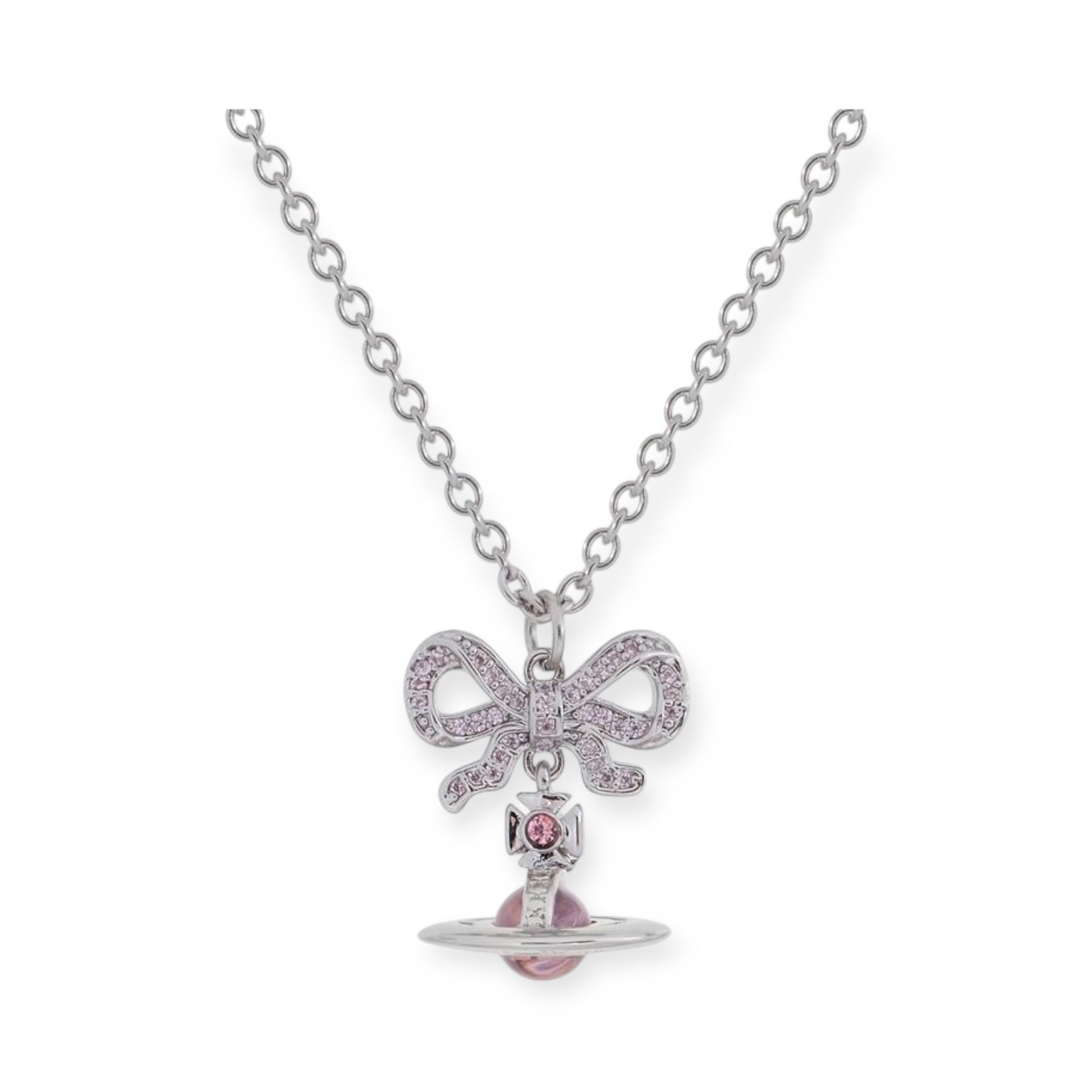 Gem Studded Bow Ribbon Mini Orb Pendant Necklace Pink & Purple (2 Colors, 2 Styles)